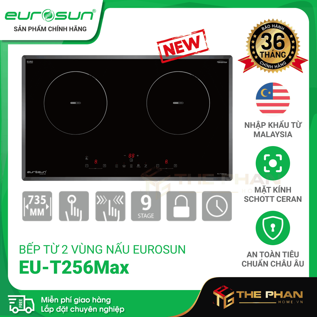 Bếp từ Eurosun EU-T256Max sử dụng bảng điều khiển cảm ứng hiện đại với 9 cấp độ công suất nhiệt độ khác nhau, điều khiển dễ dàng bằng một ngón tay, mọi chương trình nấu đều được hiển thị qua đèn Led sắc nét để bạn điều chỉnh cho phù hợp với các món ăn. Bếp còn được trang bị thêm các chức năng nấu thông minh là tính năng tạm dừng và hâm nóng.