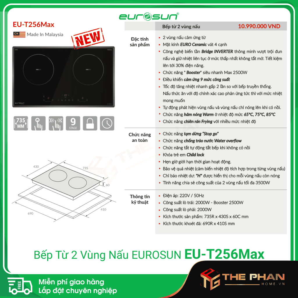 Bếp từ Eurosun EU-T256Max gồm 2 vùng nấu với tổng công suất 3500W. Công suất lò trái là 2000W khi kích hoạt tính năng Booster công suất lên tới 2500W, công suất lò phải là 2000W khi kích hoạt tính năng Booster công suất lên tới 2200W. Chức năng Booster nấu siêu nhanh, tuy nhiên thời gian tối đa mặc định dùng chức năng này là 10 phút / lần tránh quá tải.