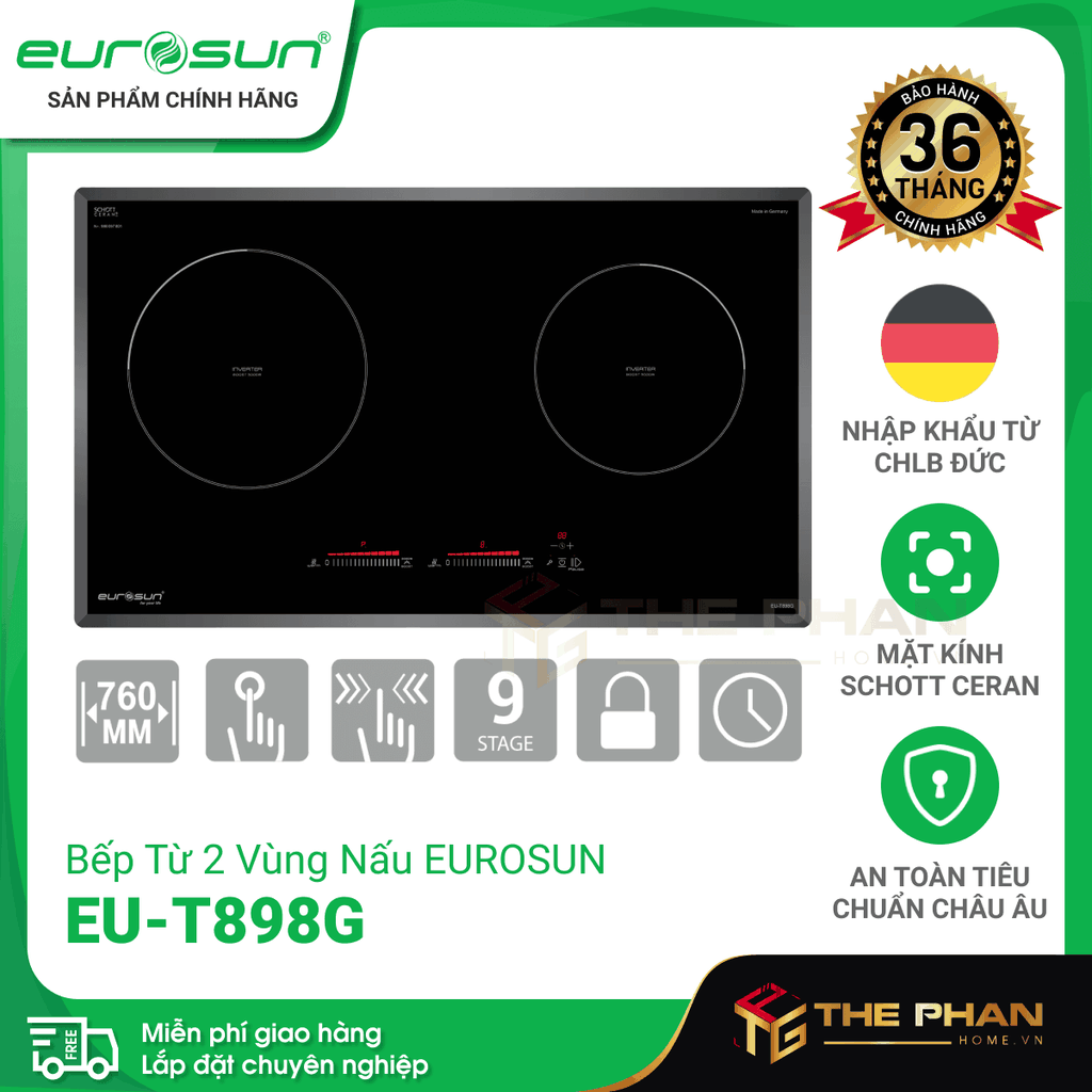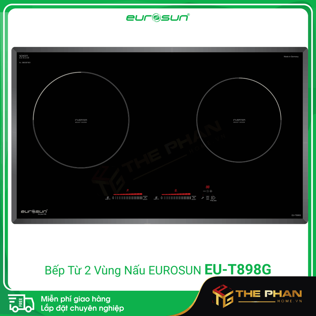 Bếp từ Eurosun EU-T898G gồm 2 vùng nấu với chức năng chia sẻ công suất MAX 3700W. Chức năng Booster nấu siêu nhanh, tuy nhiên thời gian tối đa mặc định dùng chức năng này là 10 phút/ lần tránh quá tải.