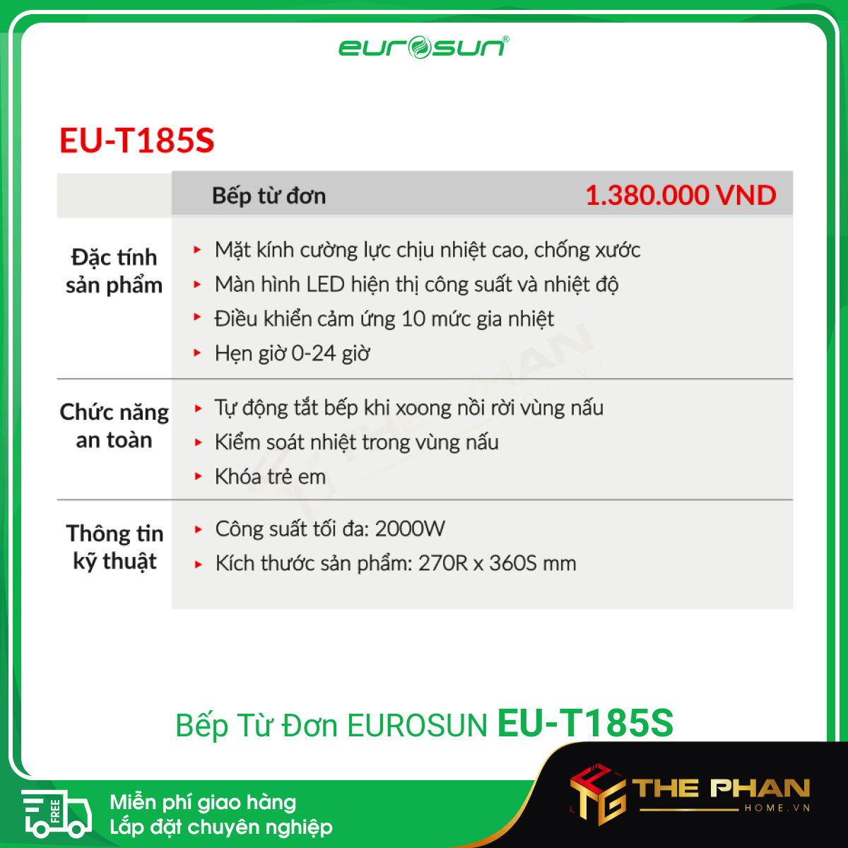 Bếp từ đơn Eurosun EU-TE185S được thiết kế 1 vùng nấu từ giúp, nhỏ gọn, công suất nấu nhanh chóng, tiết kiệm không gian, thời gian và tiết kiệm được một lượng điện năng đáng kể. Bếp dùng chất liệu mặt kính cường lực siêu bền, chịu lực tốt, chịu sốc nhiệt cao.