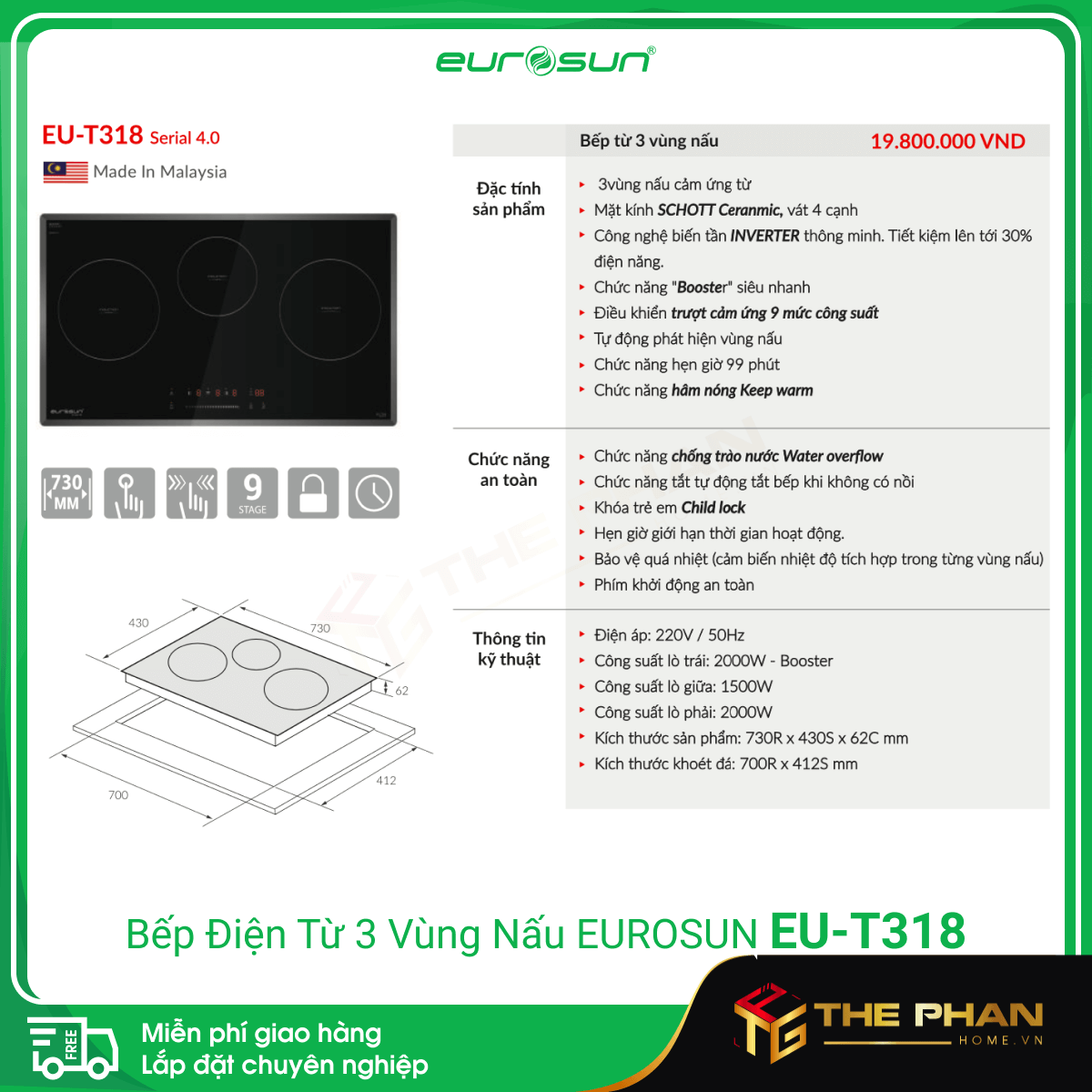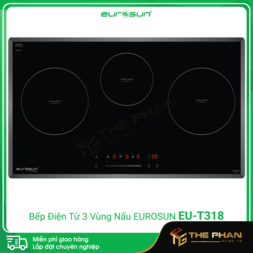Bếp từ Eurosun EU-T318 là bếp 3 lò điện từ sử dụng điều khiển cảm ứng dạng ẩn.Công nghệ cảm ứng đáy nồi tự nhận diện vùng nấu. Điều khiển dòng điện tương ứng với công suất nấu. Chiếc bếp này sẽ giúp bạn tiết kiệm 30% điện năng so với những mẫu bếp từ không có chức năng Inverter.