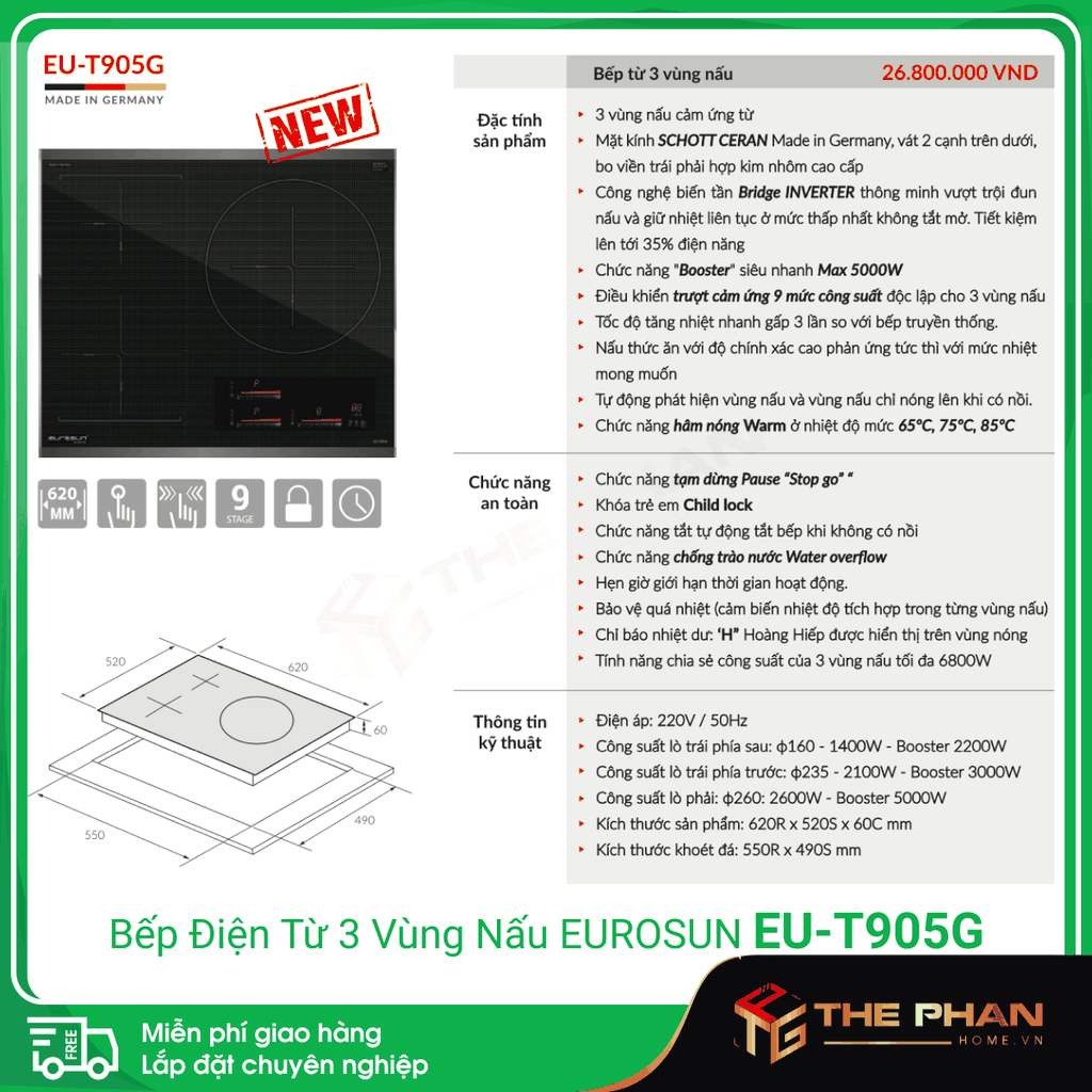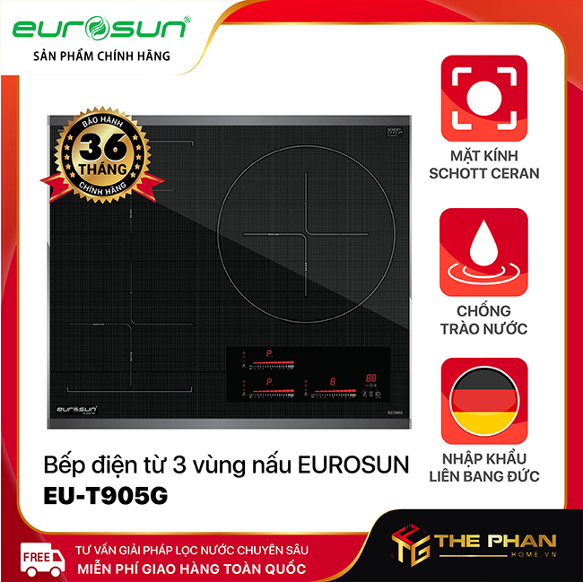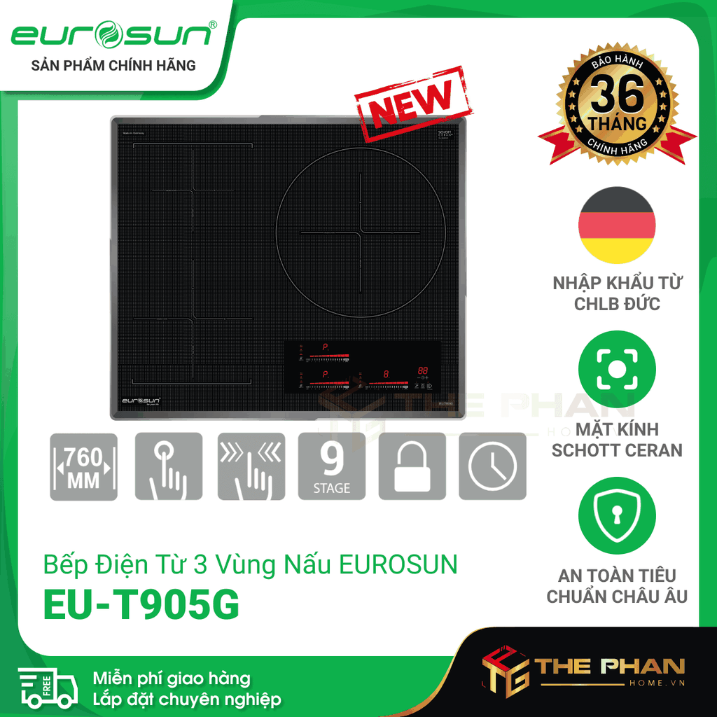 Bếp Điện Từ Ba Eurosun EU-T905G công nghệ thông minh được sản xuất tại Germany có máy móc hiện đại và tiên tiến bậc nhất trên thế giới. Sản phẩm bếp từ Eurosun EU-T905G không chỉ mang lại vẻ đẹp sang trọng hiện đại cho căn phòng bếp mà còn tích hợp nhiều công nghệ thông minh hiện đại giúp cho việc nấu ăn chưa bao giờ đơn giản đến vậy.