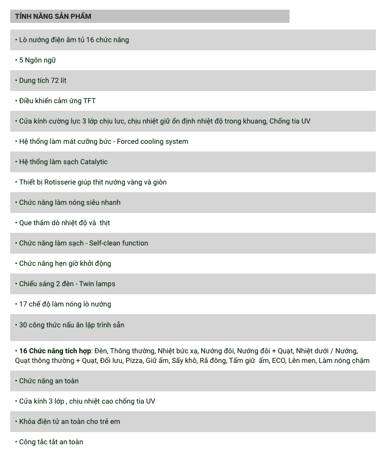 - 16 Chức năng tích hợp: Đèn, Thông thường, Nhiệt bức xạ, Nướng đôi, Nướng đôi + Quạt, Nhiệt dưới / Nướng, Quạt thông thường + Quạt, Đối lưu, Pizza, Giữ ấm, Sấy khô, Rã đông, Tấm giữ ấm, ECO, Lên men, Làm nóng chậm
