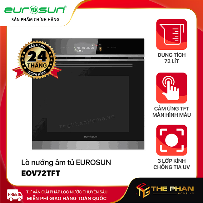 Lò Nướng Âm Tủ Eurosun EOV72TFT - 16 chức năng tích hợp, 72L là một thiết bị nhà bếp hiện đại, được nhập khẩu từ Malaysia. Thiết bị nhà bếp này nổi bật về cả thiết kế lẫn các tính năng sử dụng. Mang đến sự tiện lợi và hài lòng cho khách hàng. Sản phẩm lò nướng Eurosun EOV72TFT chính hãng được thiết kế hệ thống bảng cảm ứng nên vô cùng dễ dàng khi sử dụng. Lò Nướng Âm Tủ Eurosun EOV72TFT - 16 chức năng tích hợp, 72L luôn mang tới những món ăn được chế biến hoàn hảo. Nhờ thiết kế hiện đại cùng những tính năng vô cùng ưu việt.