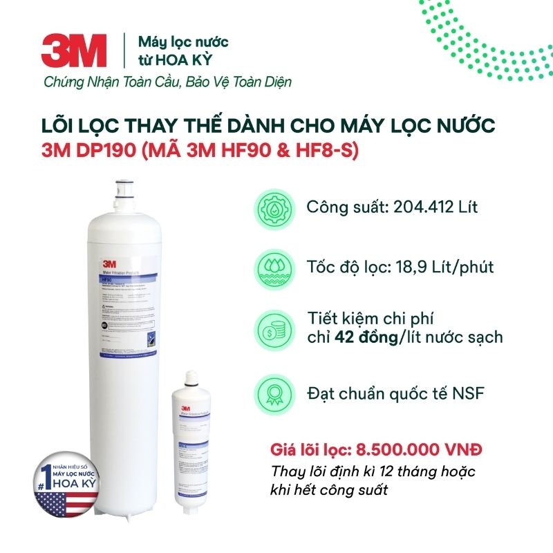 Với công suất lọc lên đến 204.412 lít và tốc độ lọc 18,9 lít/phút, bộ lõi lọc HF90 và HF8-S đáp ứng nhu cầu sử dụng nước sạch liên tục cho các cơ sở kinh doanh có quy mô lớn. Sản phẩm không sử dụng điện và không tạo ra nước thải, giúp tiết kiệm chi phí vận hành và bảo vệ môi trường.