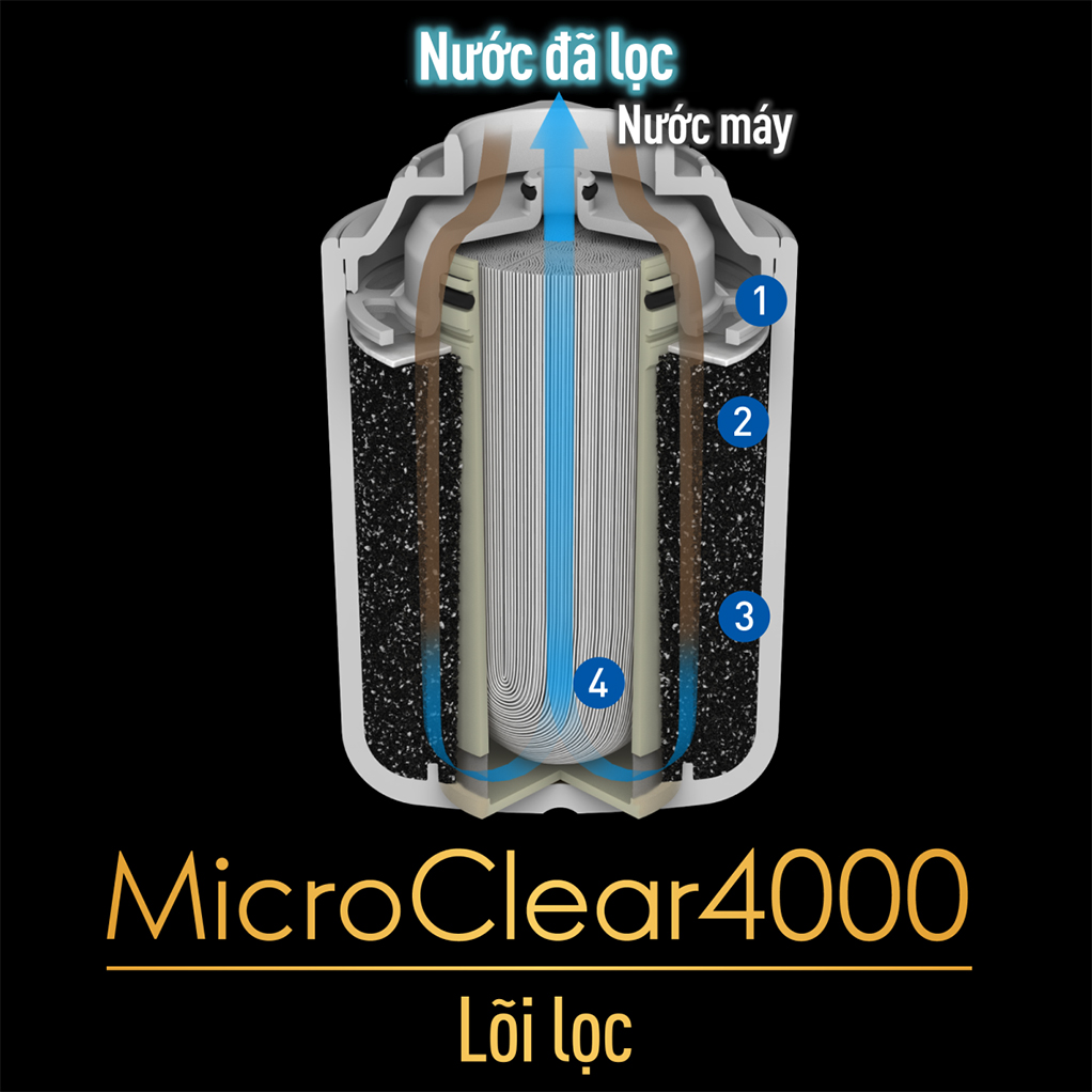 Lõi lọc MicroClear4000 chứa gấp 1,7 lần lượng than hoạt tính hiệu suất cao với công nghệ độc quyền so với lõi lọc của sản phẩm thông thường. Thiết bị có thể lọc sạch 4.000 L nước máy, loại bỏ 17 tạp chất và 99,999% vi khuẩn. Bạn không cần phải thay lõi lọc thường xuyên.
