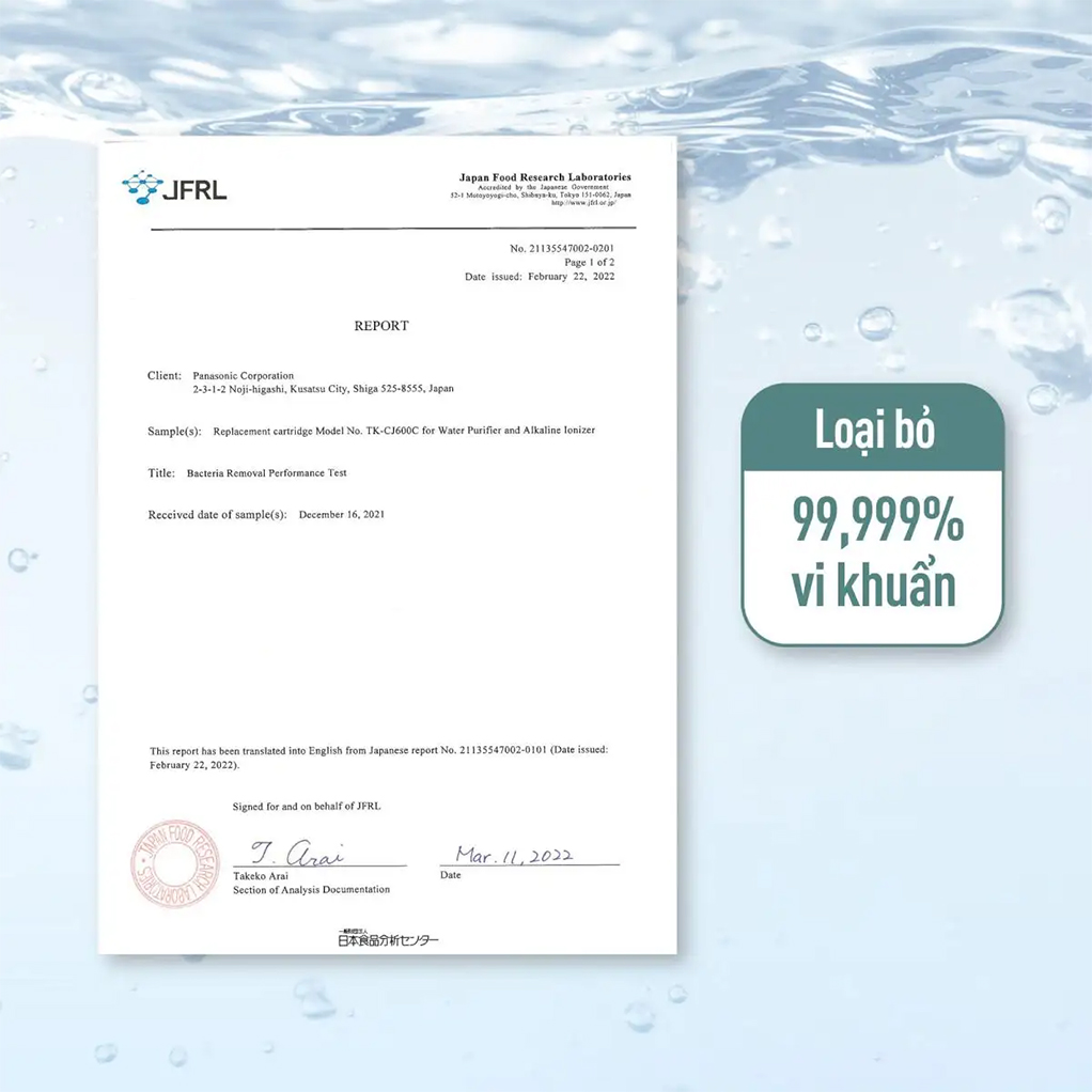 Hệ thống lọc nước 4 giai đoạn loại bỏ 99,999% vi khuẩn và được Phòng Thí nghiệm Nghiên cứu Thực phẩm Nhật Bản kiểm chứng.