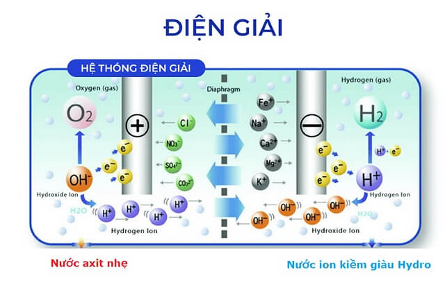 Đồng thời, các electron ở cực âm mang điện tích âm (e-) sẽ liên kết với các hydro điện tích dương để tạo thành khí hydro (H2) và các ion hydroxit (OH-). H2 là hydro phân tử hay hydrogen, có khả năng chống oxi hóa mạnh và loại bỏ các gốc tự do để bảo vệ tế bào.