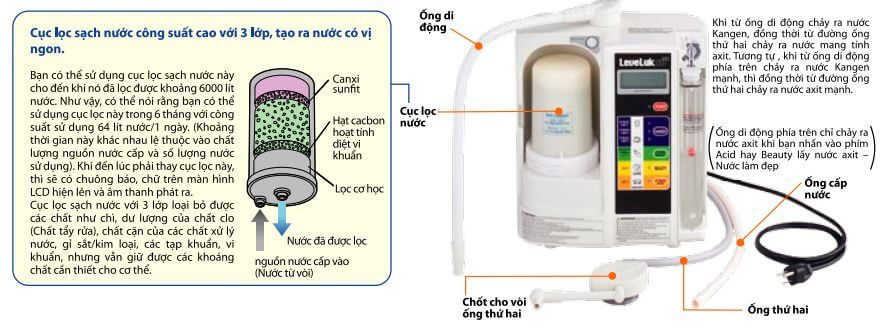 - Nước lọc rất sạch và vẫn giữ lại được các khoáng chất tự nhiên cần thiết cho cơ thể là các nguyên tố tạo tính Kiềm (ion Canxi, Kali, Natri, Magie). Khả năng lọc khoảng 12,000 lit nước (Tùy chất lượng nước đầu vào) (Thay lõi lọc sau khoảng 16 tháng).