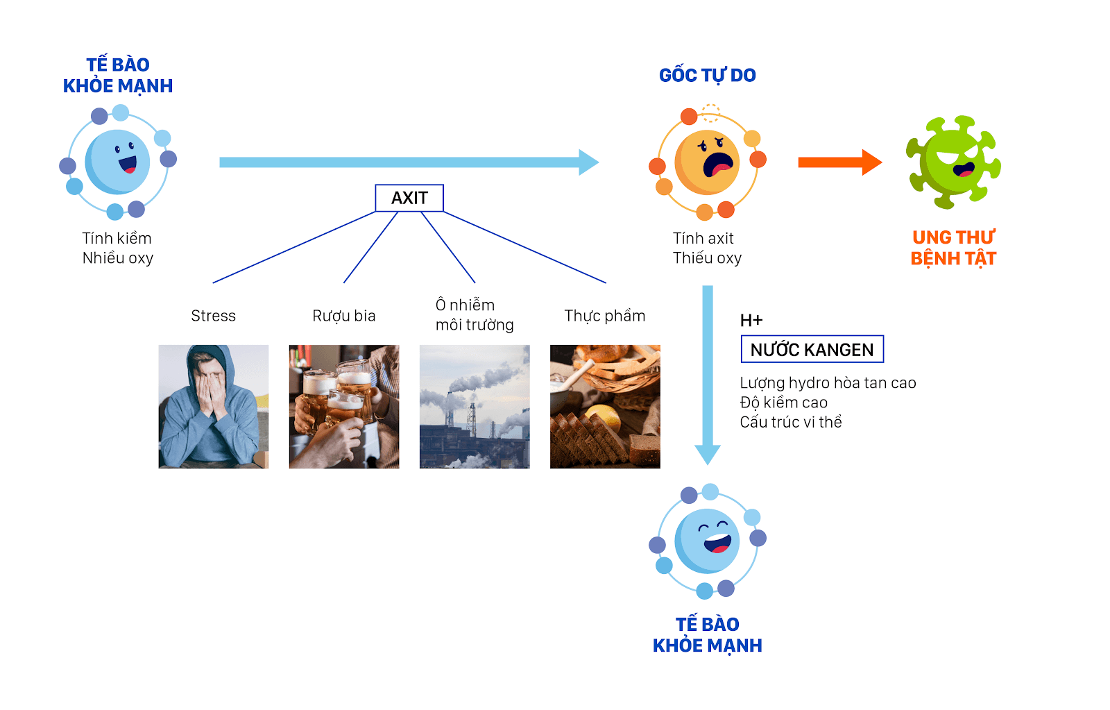 - Chính nhờ vào công nghệ điện giải bậc nhất hiện nay. Máy có khả năng phân tách các phân tử nước thông thường thành các ion giàu oxy. Trung hoà các gốc tự do mang tính axit được đào thải ra ngoài và phòng ngừa các căn bệnh ung thư.