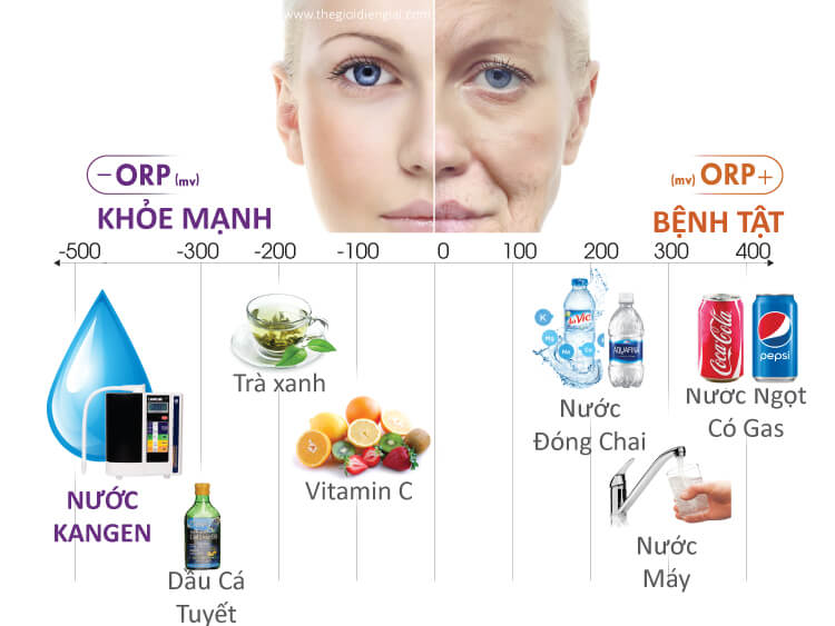 - Ngoài ra các gốc tự do cũng là một trong những tác nhân gây lão hoá và nhờ vào tính năng từ máy lọc nước điện giải tạo ra các -ORP và các Hydrogen chống oxy hoá mạnh mẽ.