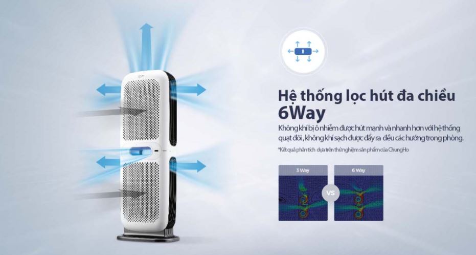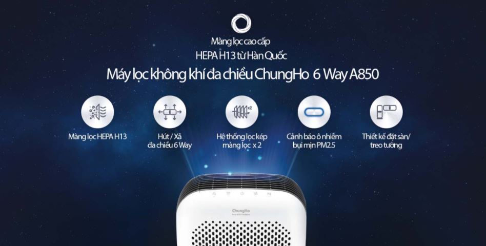 Máy Lọc Không Khí ChungHo 6-Way A850 HEPA là sản phẩm cao cấp nhất trong “đại gia đình” ChungHo. Được đầu tư nghiên cứu và phát triển sản phẩm máy lọc không khí 6-Way HEPA A850 sở hữu công nghệ lọc hiện đại nhất, đi cùng với 1 chiều hút gió và 5 chiều thổi gió ra, màng lọc HEPA H13 cao cấp loại bỏ 99,97% bụi siêu mịn kích thước 0,3um mang đến không khí trong lành cho cả gia đình.