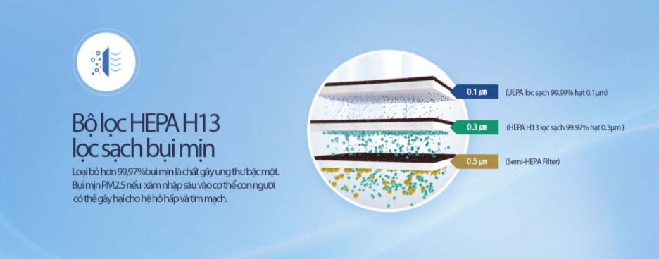 Loại bỏ hơn 99.97% bụi mịn là chất gây ung thư bậc một. Bụi mịn PM2.5 nếu xâm nhập vào sâu cơ thể con người có thể gây hại cho hệ hô hấp và tim mạch