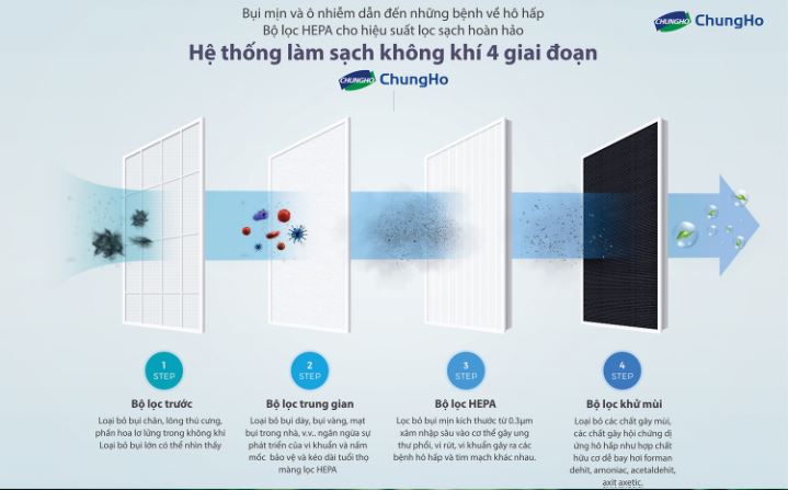 Máy lọc không khí Chungho HEPA – Whirlis Silent có hệ thống lọc thế hệ mới được cấu tạo từ 4 lớp siêu lọc, có khả năng loại bỏ bụi mịn, vi khuẩn có hại và các chất gây mùi, giúp cho không khí xung quanh bạn luôn được làm sạch tối đa nhưng vẫn không hề tiêu hao quá nhiều điện năng.