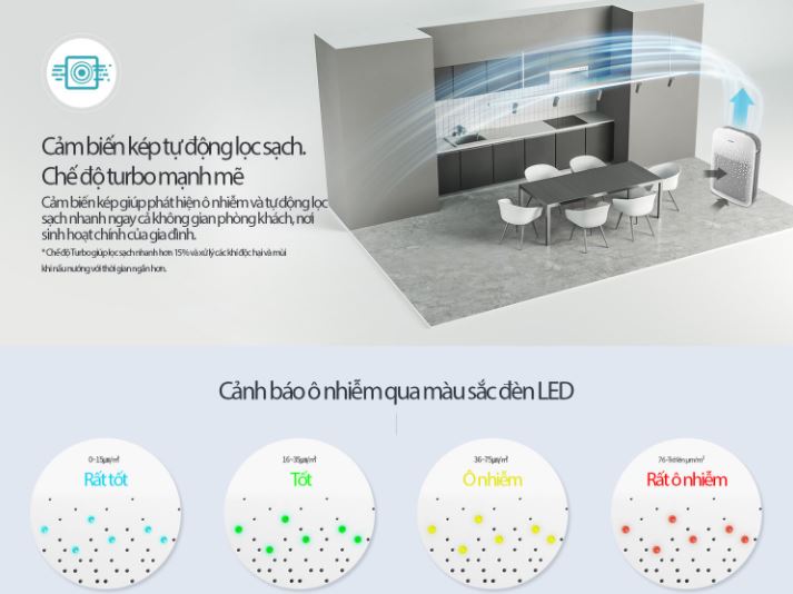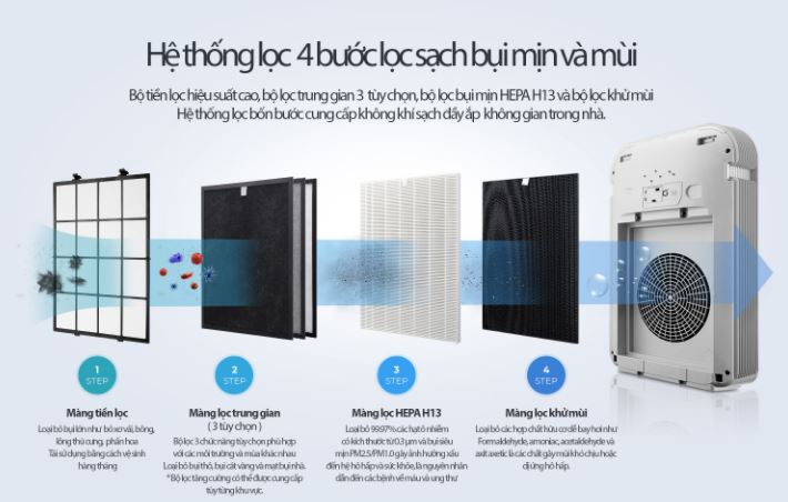 Bộ lọc diệt khuẩn HEPA và bộ lọc khử mùi loại bỏ bụi bẩn, ẩm mốc và các mùi khó chịu mang đến không gian sạch sẽ, bảo vệ sức khỏe. Máy liên tục phân tích chất lượng không khí và tự động kiểm soát luồng không khí bằng cảm biến.