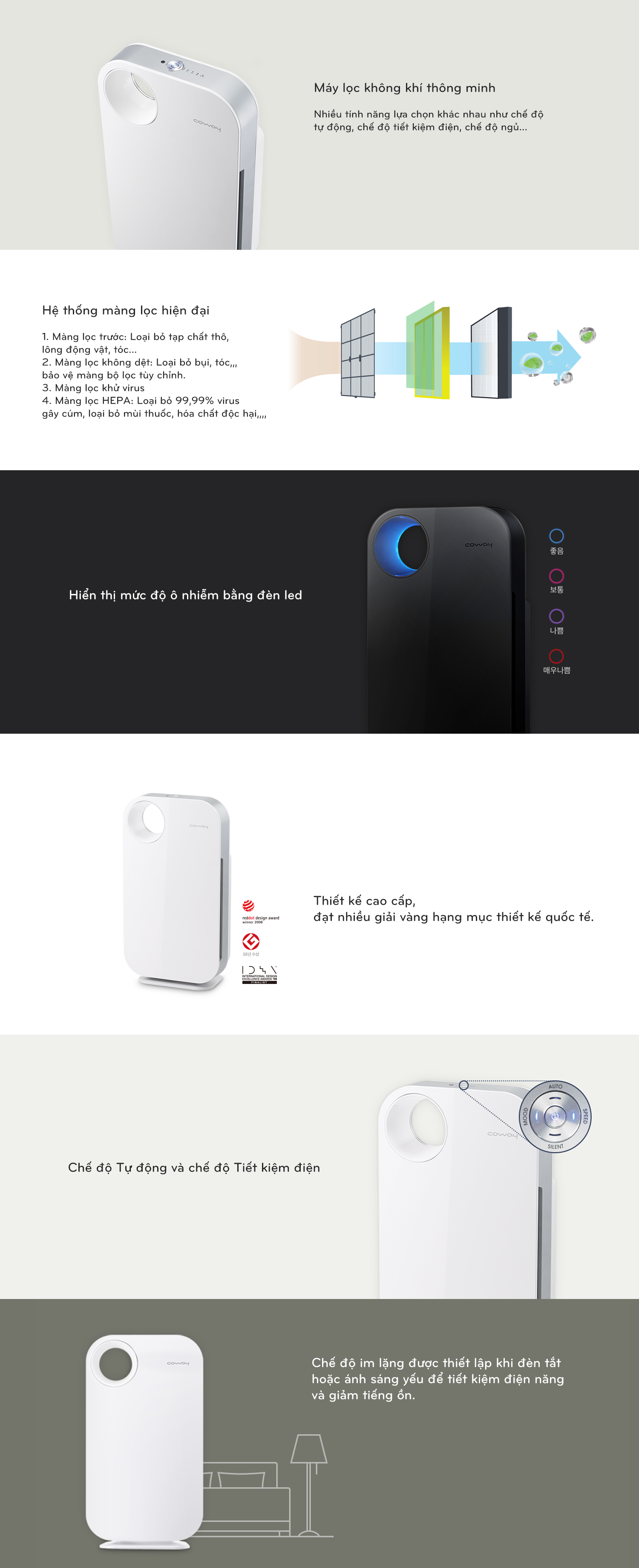 • Công nghệ màng lọc True HEPA thảo dược độc quyền của Coway loại bỏ trên 99% bụi 0.3µm, nấm mốc, khí gas, vi khuẩn và virus, đặc biệt là cúm A H5N1, H1N1