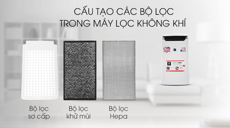 - BỘ LỌC HEPA: Bộ lọc HEPA 99,99% hạt có cỡ nhỏ khoảng 0,3 micron. Máy lọc không khí hoạt động theo cơ chế hút không khí vào bên trong máy, dẫn không khí qua bộ lọc bụi sơ cấp, sau đó qua bộ lọc khử mùi và cuối cùng bộ lọc HEPA và đưa không khí sạch trở lại phòng.
