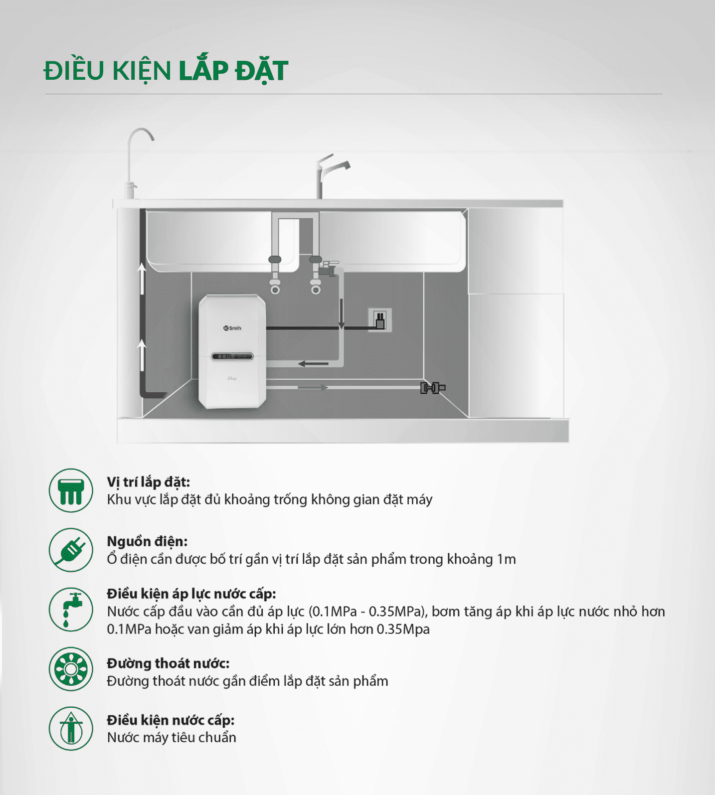 • Áp suất nước cấp phù hợp 0.1MPa ~ 0.35MPa