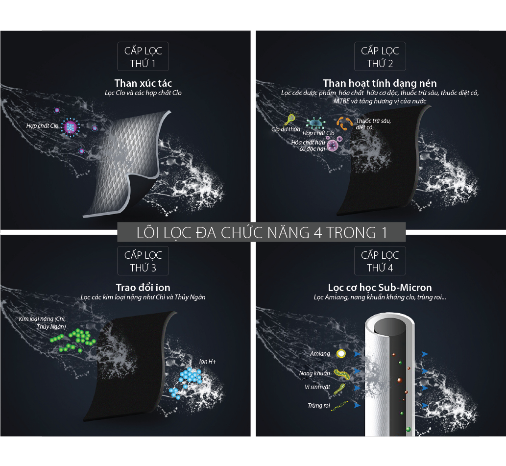 • Loại bỏ chì, thủy ngân, amiăng, thuốc trừ sâu, dược phẩm,clo, BPA, PFOA/PFOS, cặn lắng, cặn lơ lửng…
