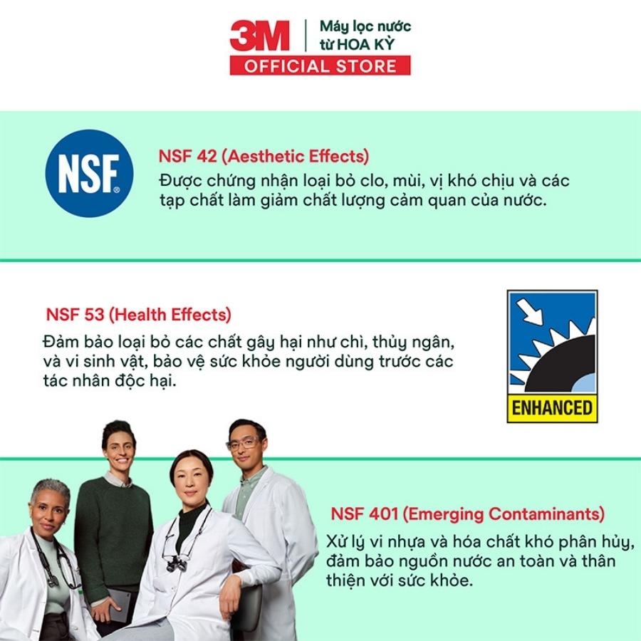 Máy lọc nước 3M CTM-02 đạt tiêu chuẩn NSF/ANSI 42 và 53, đây là những chứng nhận an toàn hàng đầu về chất lượng nước uống trên thế giới. Các tiêu chuẩn này đảm bảo rằng sản phẩm có khả năng loại bỏ tạp chất, kim loại nặng và vi khuẩn có hại, mang lại nguồn nước sạch và tinh khiết cho người sử dụng.