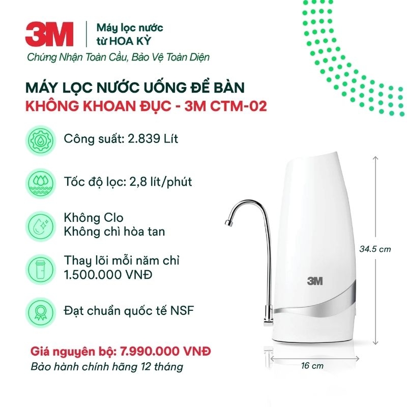 Trong thời đại ô nhiễm môi trường ngày càng gia tăng, việc sử dụng nguồn nước sạch và an toàn là mối quan tâm hàng đầu của nhiều gia đình. Để đáp ứng nhu cầu đó, máy lọc nước uống để bàn 3M CTM-02 ra đời như một giải pháp tối ưu, giúp loại bỏ tạp chất, vi khuẩn và các kim loại nặng, mang lại nguồn nước tinh khiết, đảm bảo sức khỏe cho người sử dụng. Hãy cùng tìm hiểu những ưu điểm nổi bật của sản phẩm này qua bài viết dưới đây.