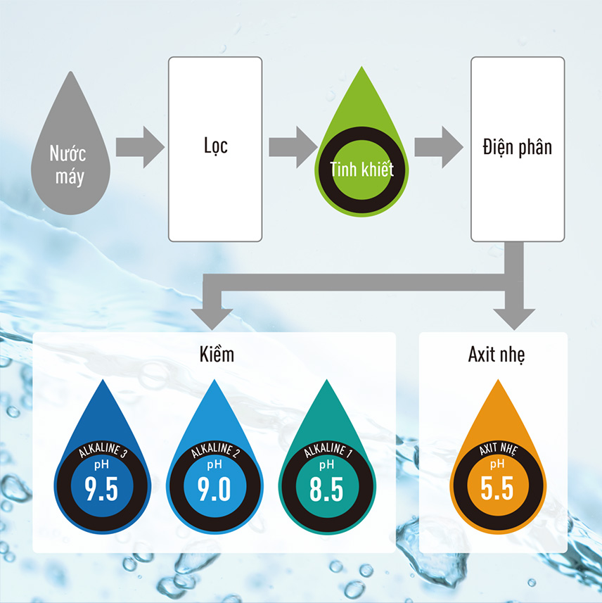 Tạo ra năm loại nước cho các mục đích sử dụng khác nhau - ba mức nước ion kiềm, nước ion axit và nước tinh khiết. Ngoài việc đảm bảo an toàn để uống, nước ion kiềm còn cải thiện chức năng tiêu hóa và có thể được sử dụng tốt trong nấu nướng.