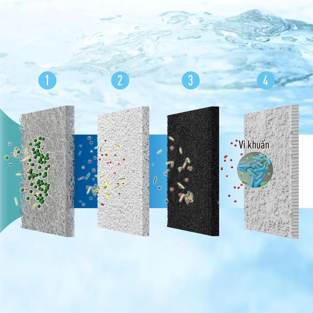 Bộ lọc được làm bằng bốn loại vật liệu có các lỗ kích thước khác nhau giúp loại bỏ hoàn toàn các chất có hại và 99,999% vi khuẩn. 1 Vải không dệt, 2 Sứ, 3 Than hoạt tính, 4 Màng sợi rỗng. (* Hình ảnh chỉ mang tính minh họa.)