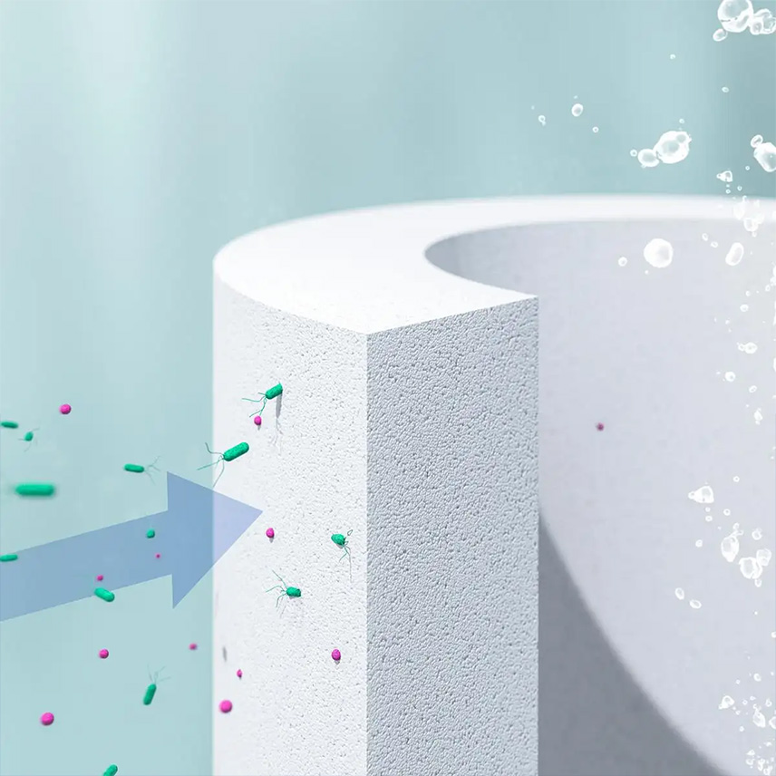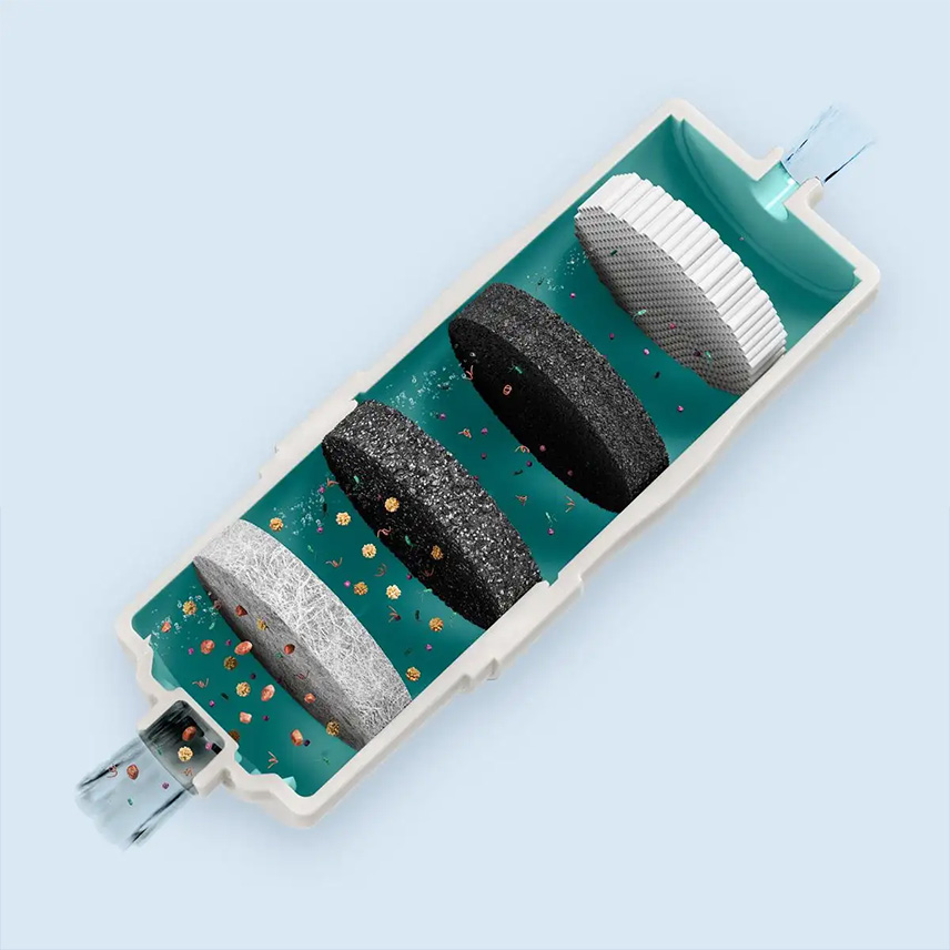 Các bộ lọc được làm từ bốn loại vật liệu với kích thước lỗ khác nhau: Vải không dệt, gốm, than hoạt tính và màng sợi rỗng loại Siêu lọc. * Hình ảnh chỉ mang tính minh họa.