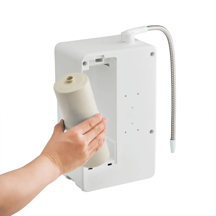 Tháo nắp từ phía sau của máy lọc nước ion kiềm, ấn xuống và kéo lõi lọc về phía bạn, sau đó nâng lên để gỡ ra. Làm theo trình tự ngược lại để lắp vào.
