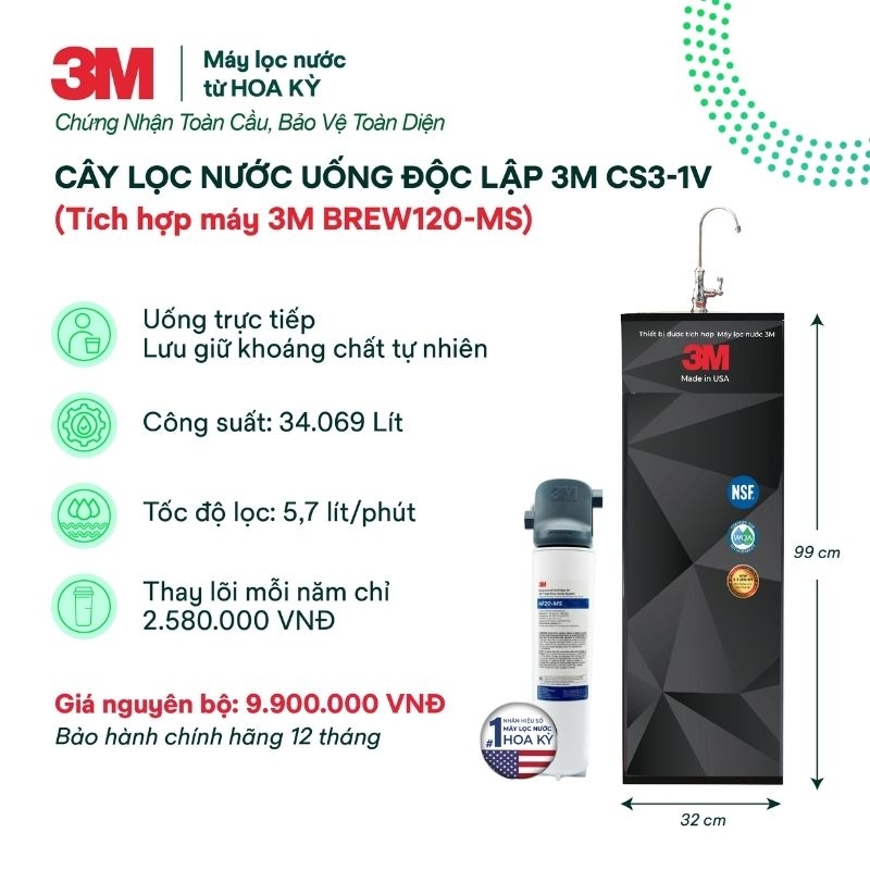 Cây lọc nước uống độc lập 3M CS3-1V là một giải pháp lý tưởng giúp mang lại nguồn nước tinh khiết, an toàn và tiện lợi cho mọi không gian. Với thiết kế sang trọng, công nghệ lọc tiên tiến, khả năng lọc mạnh mẽ và không sử dụng điện, sản phẩm này chắc chắn là lựa chọn hoàn hảo để bảo vệ sức khỏe gia đình và nâng cao chất lượng cuộc sống. Nếu bạn đang tìm kiếm một cây lọc nước uống cao cấp, 3M CS3-1V chính là lựa chọn đáng đầu tư!