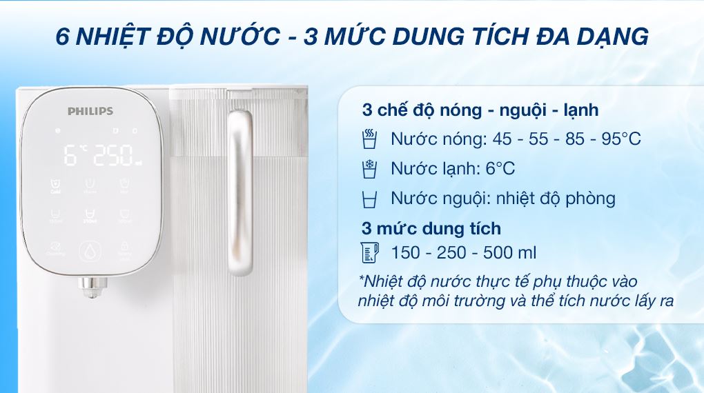 *Nhiệt độ nước thực tế sẽ phụ thuộc vào nhiệt độ môi trường và thể tích nước lấy ra.