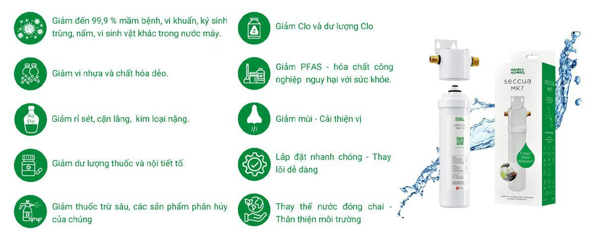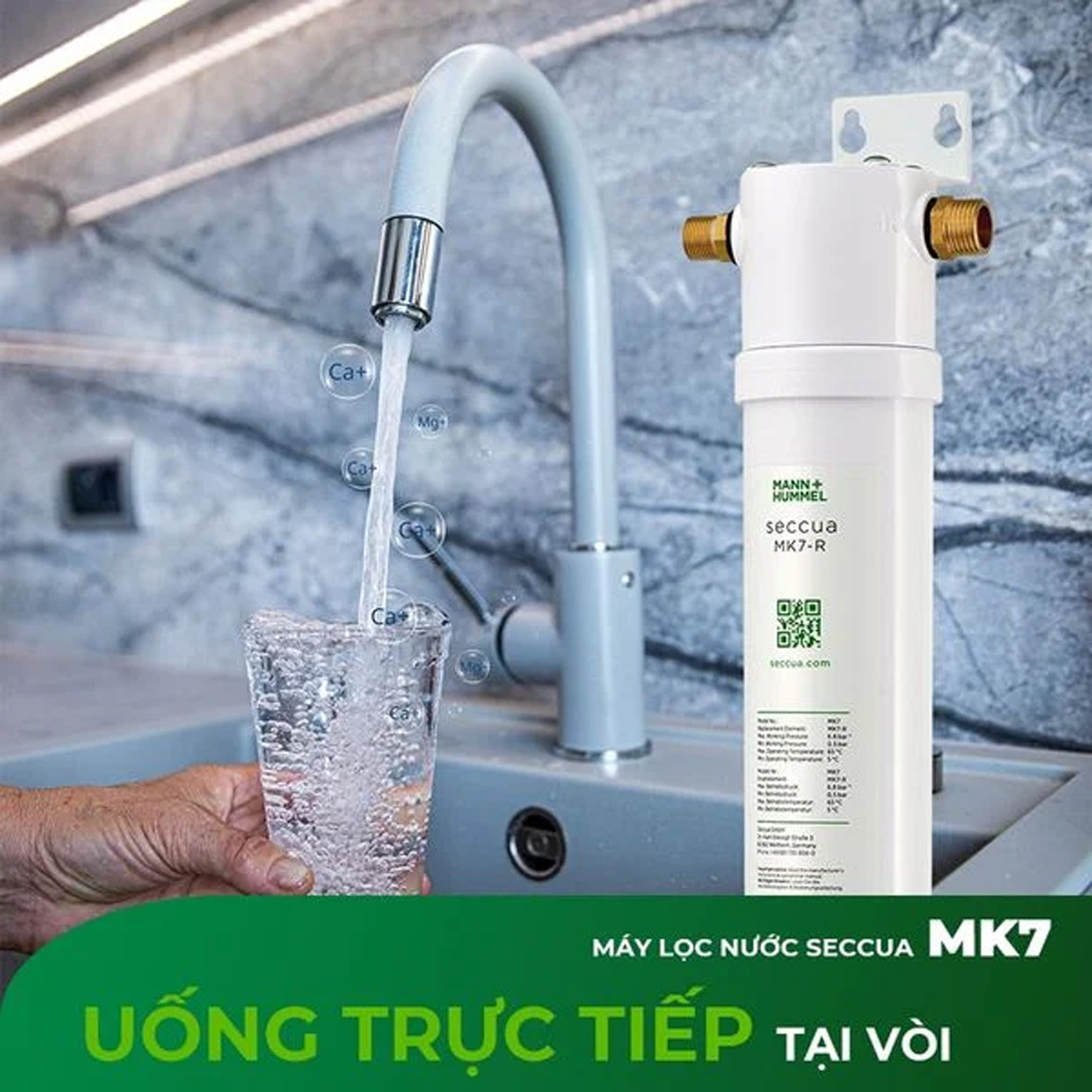 Seccua MK7 là máy lọc nước đạt chuẩn nước uống trực tiếp tại vòi theo QCVN 6-1:2010/BYT, không dùng điện, không tạo nước thải, thân thiện với môi trường. Thích hợp dùng để lọc nước cho hộ gia đình, vì có kích thước nhỏ gọn, hiệu năng mạnh mẽ. Nước sau lọc giữ được khoáng chất tươi mát, mùi vị thơm ngon.