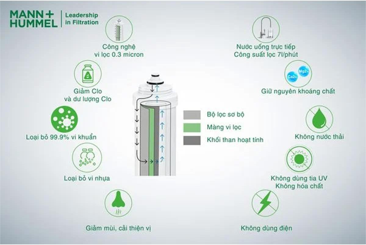 Quá trình lọc cơ học. Hoàn toàn Không dùng điện, hóa chất, tia UV...để lọc nước